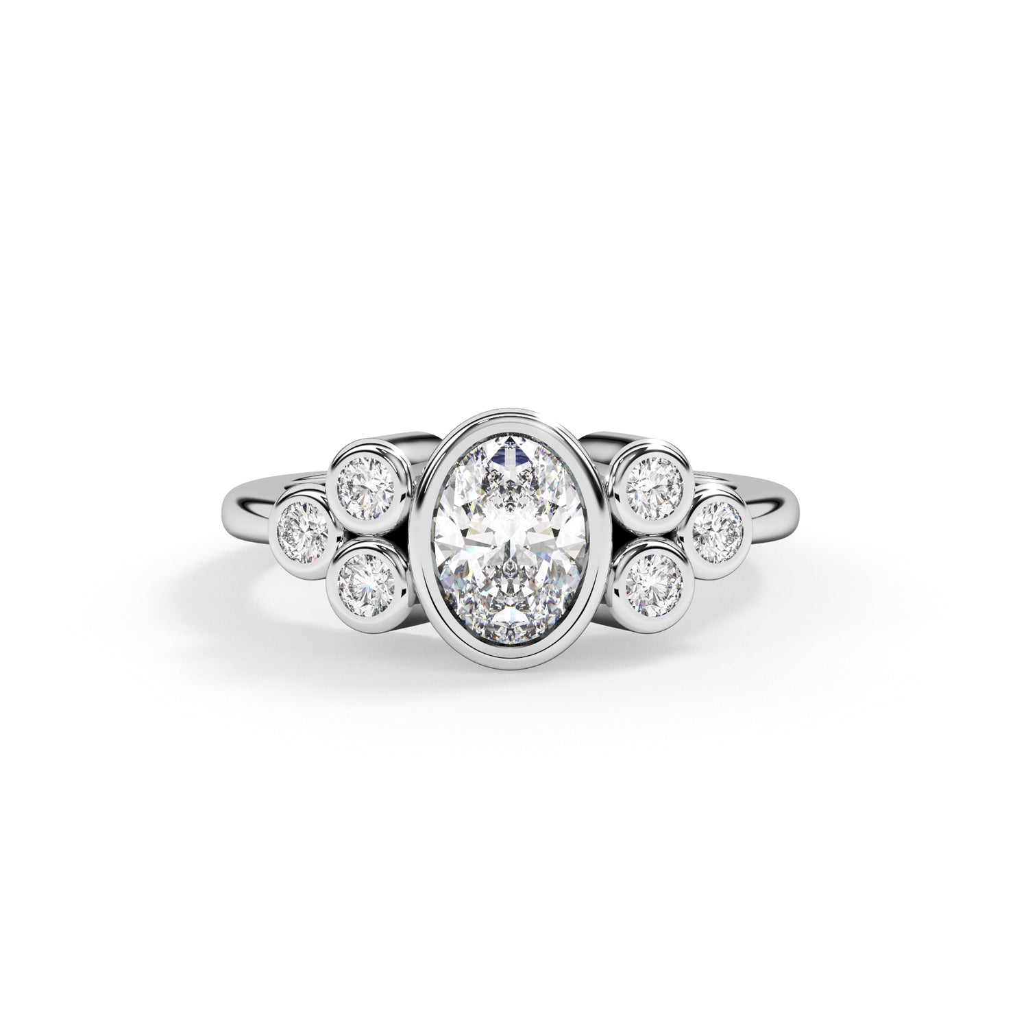 A contemporary ring named after the goddess of love and beauty. This innovative piece features a central stone with three stones on each side, all set in a rubover setting. With its modern design and symbolic allure, Aphrodite is a captivating choice for expressing eternal love and devotion.