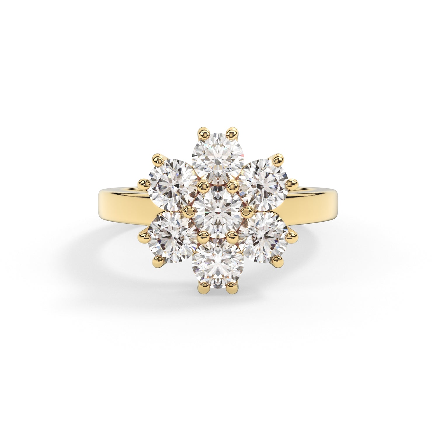 A captivating seven-stone ring inspired by the mythical goddess of spring. Crafted in the shape of a delicate flower, each stone represents a petal, symbolizing beauty, renewal, and the cycle of life. With its intricate design and ethereal charm, Persephone embodies the essence of eternal bloom and new beginnings, making it a mesmerizing symbol of love and transformation.