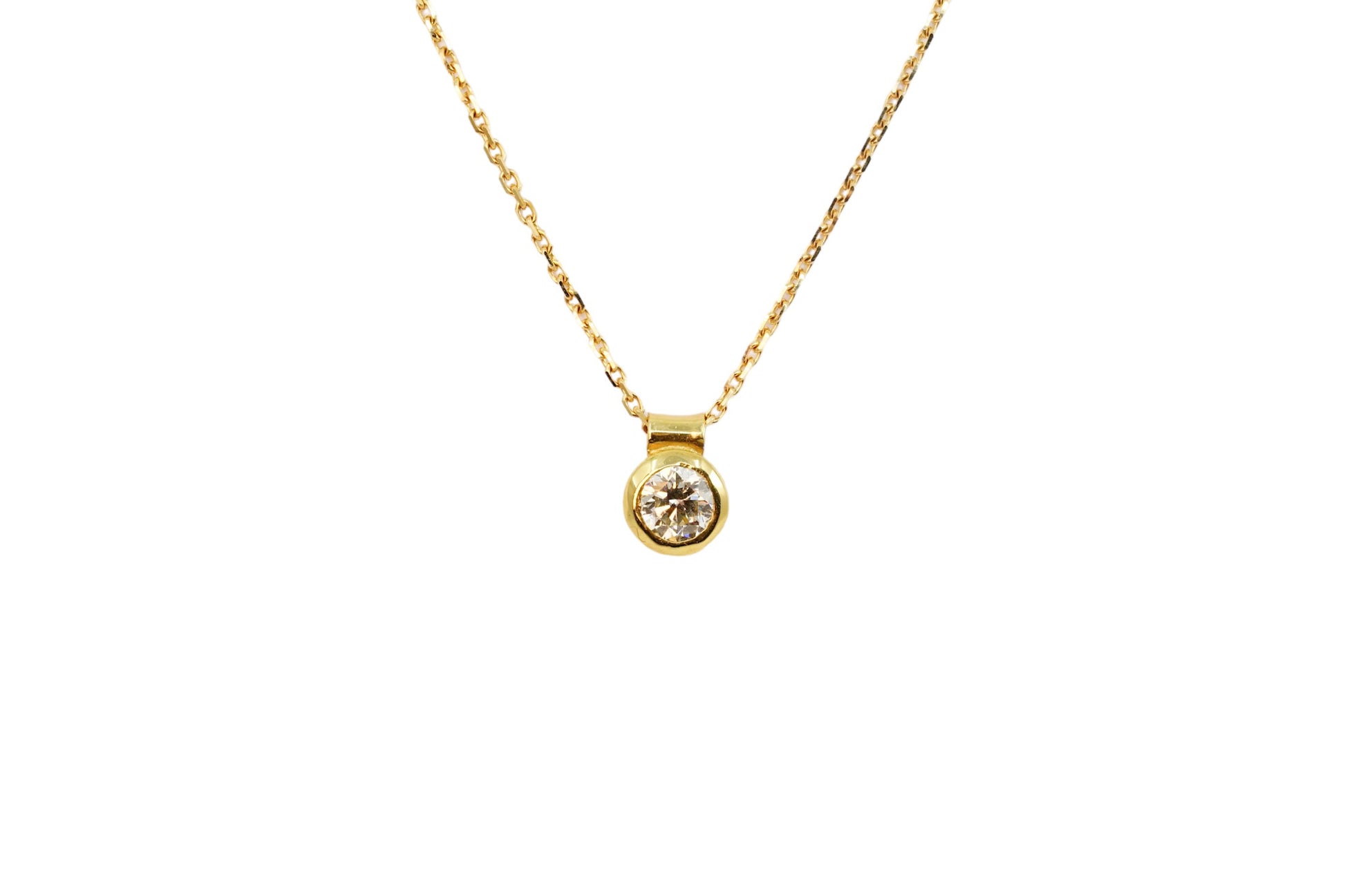 Our best-selling diamond pendant is set in 18ct yellow gold on a sparkling gold chain. Available in stock in two sizes. Please contact us if you would like a different size.