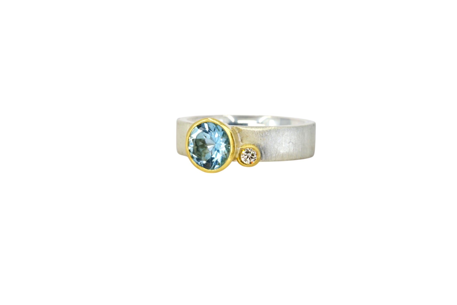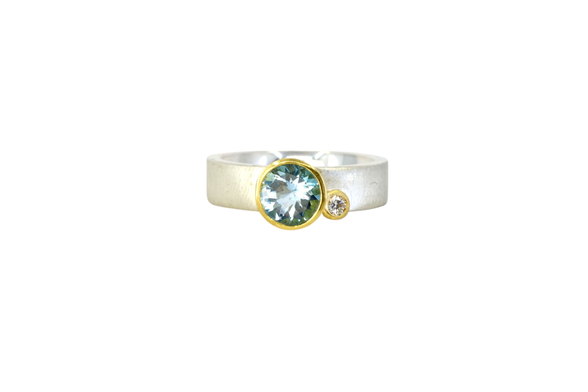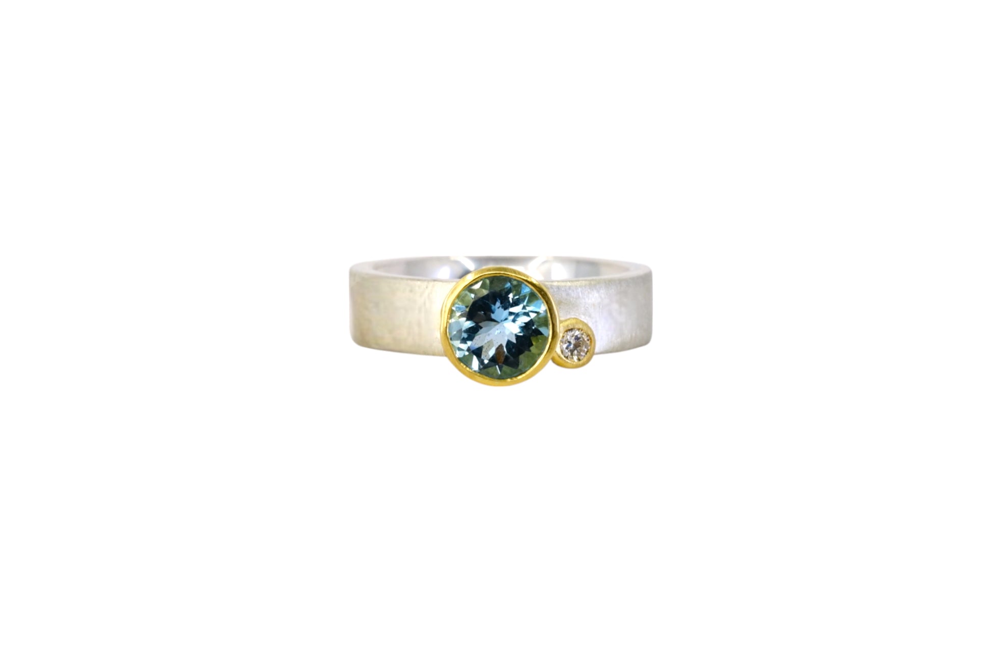 A beautiful blue aquamarine is set in 18ct yellow gold, with a little diamond set off-centre on a wide sterling silver band. The asymmetric design adds a modern touch to this classic pairing.