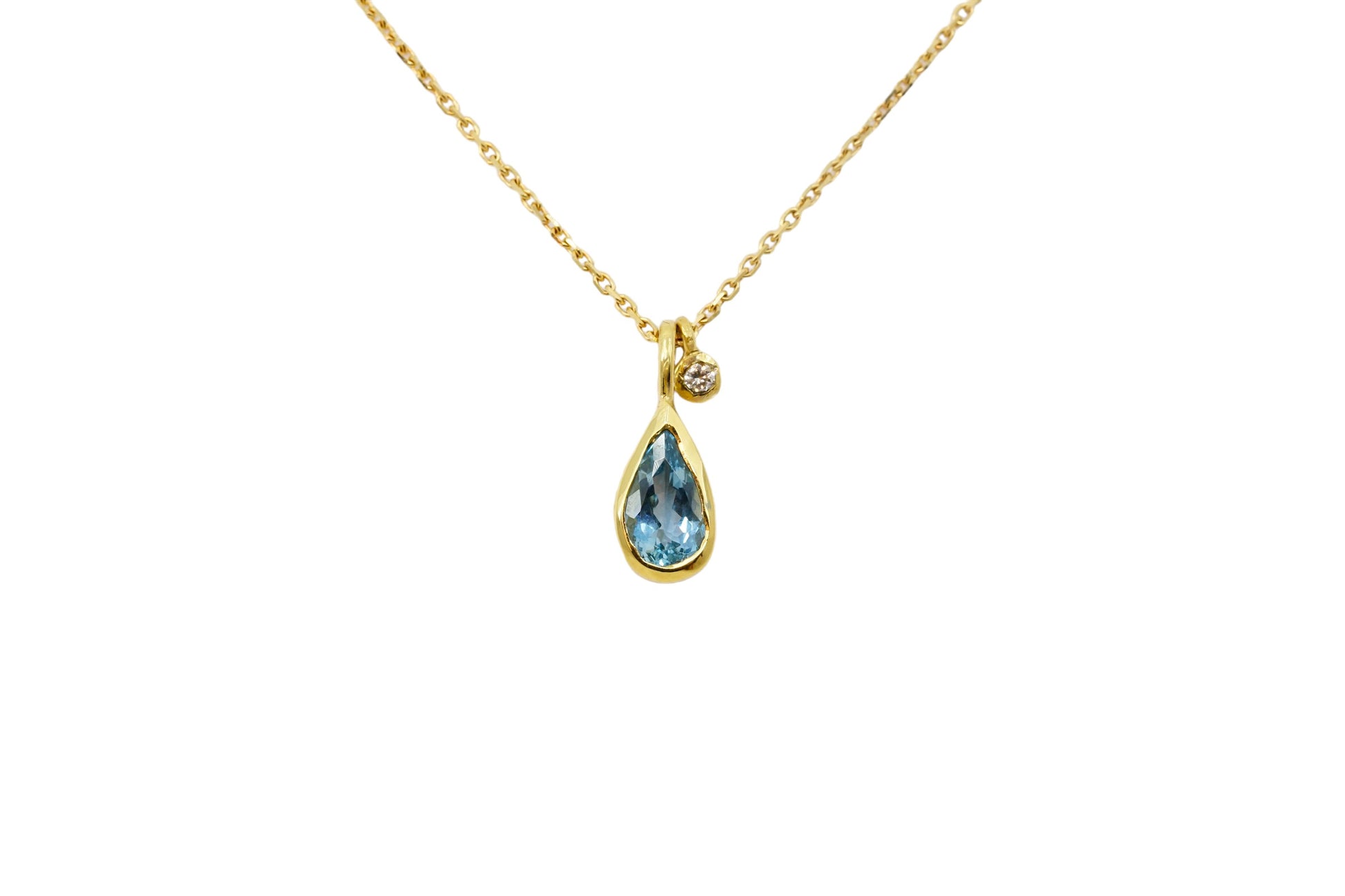A pear-cut aquamarine and diamond pendant necklace on an 18ct gold chain.