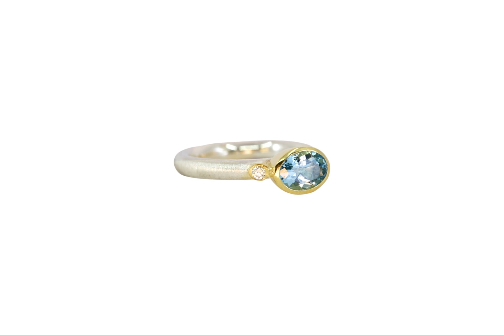 A bold statement for the modern jewellery lover. This chunky trilogy ring features a luminous oval aquamarine flanked by sparkling diamonds, all set in rich 18ct yellow gold atop a weighty, round sterling silver band. Each ring is handcrafted by Libby, ensuring comfort, quality, and a truly unique finish. Designed for everyday comfort and style. Luxury presentation box included. Perfect for marking a special occasion or elevating your daily look.