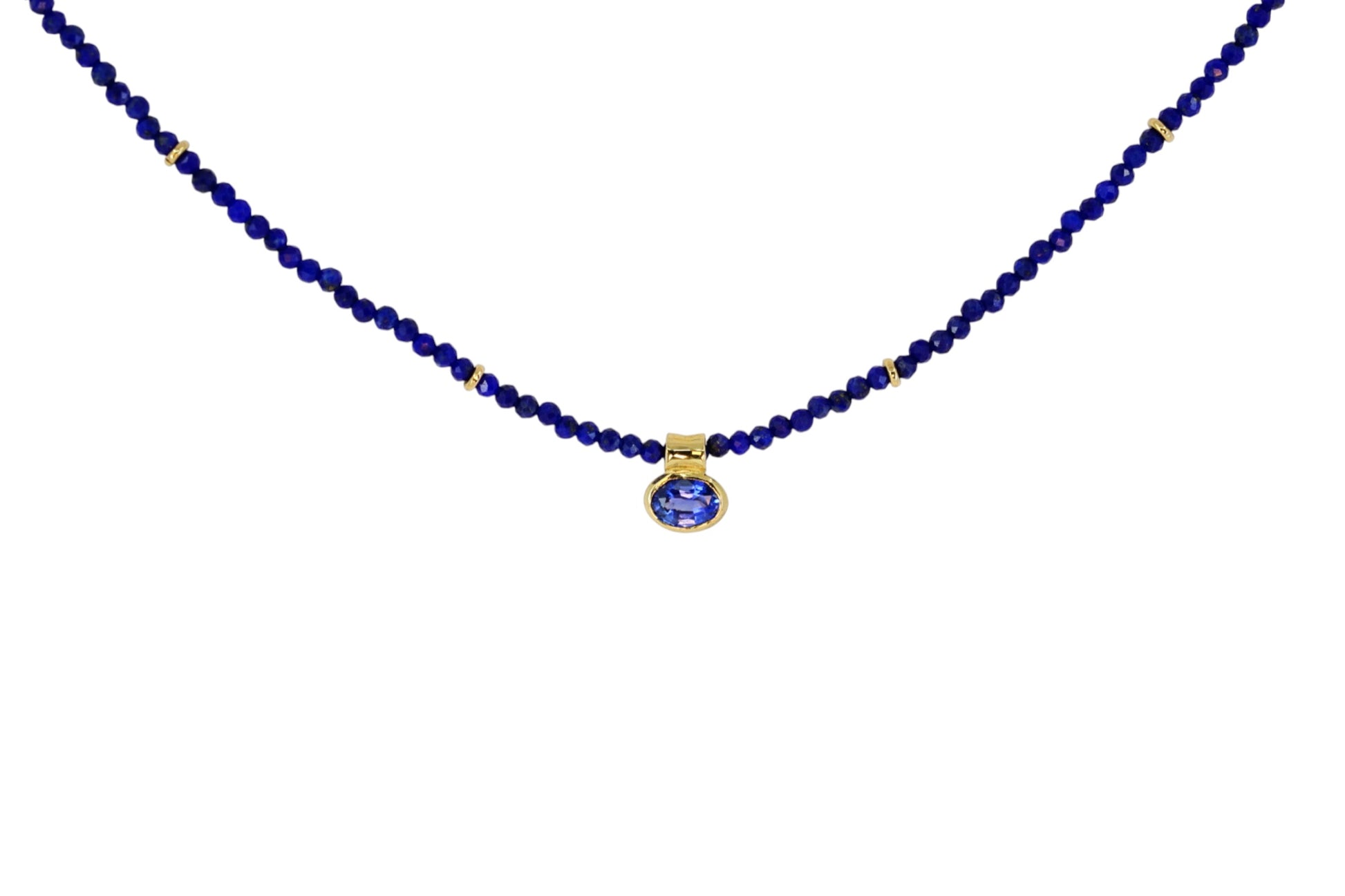 A vivid blue sapphire, set in 18ct yellow gold, sits at the centre of fine lapis lazuli beads. This handcrafted necklace brings together the deep blue of lapis with the brilliance of sapphire, all designed for everyday luxury. Comfortable and elegant. Unique, handcrafted finish.