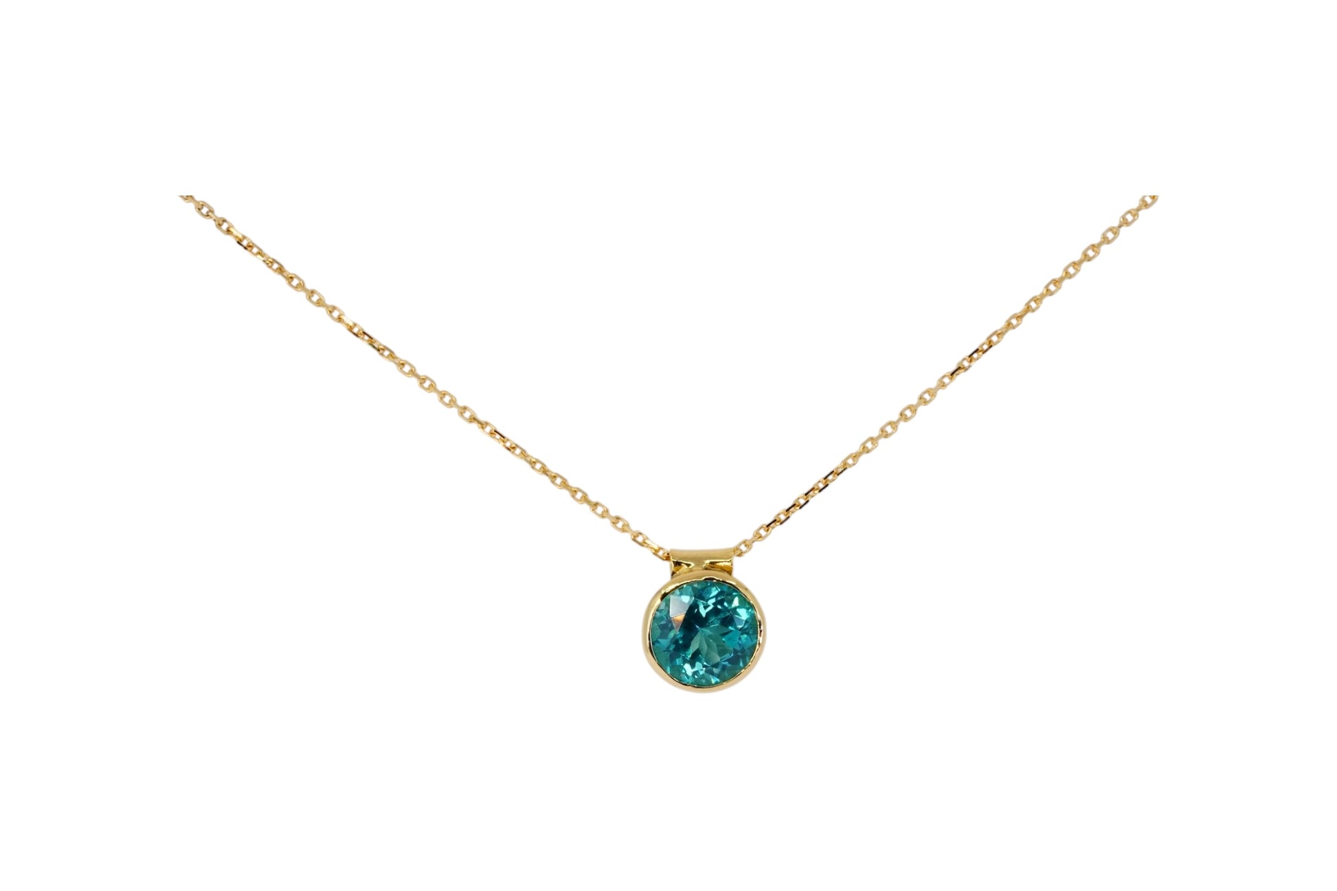 A round, bright turquoise apatite is set in 18ct yellow gold and suspended from a sparkling diamond-cut chain. This pendant brings a cheerful, uplifting touch to any look.