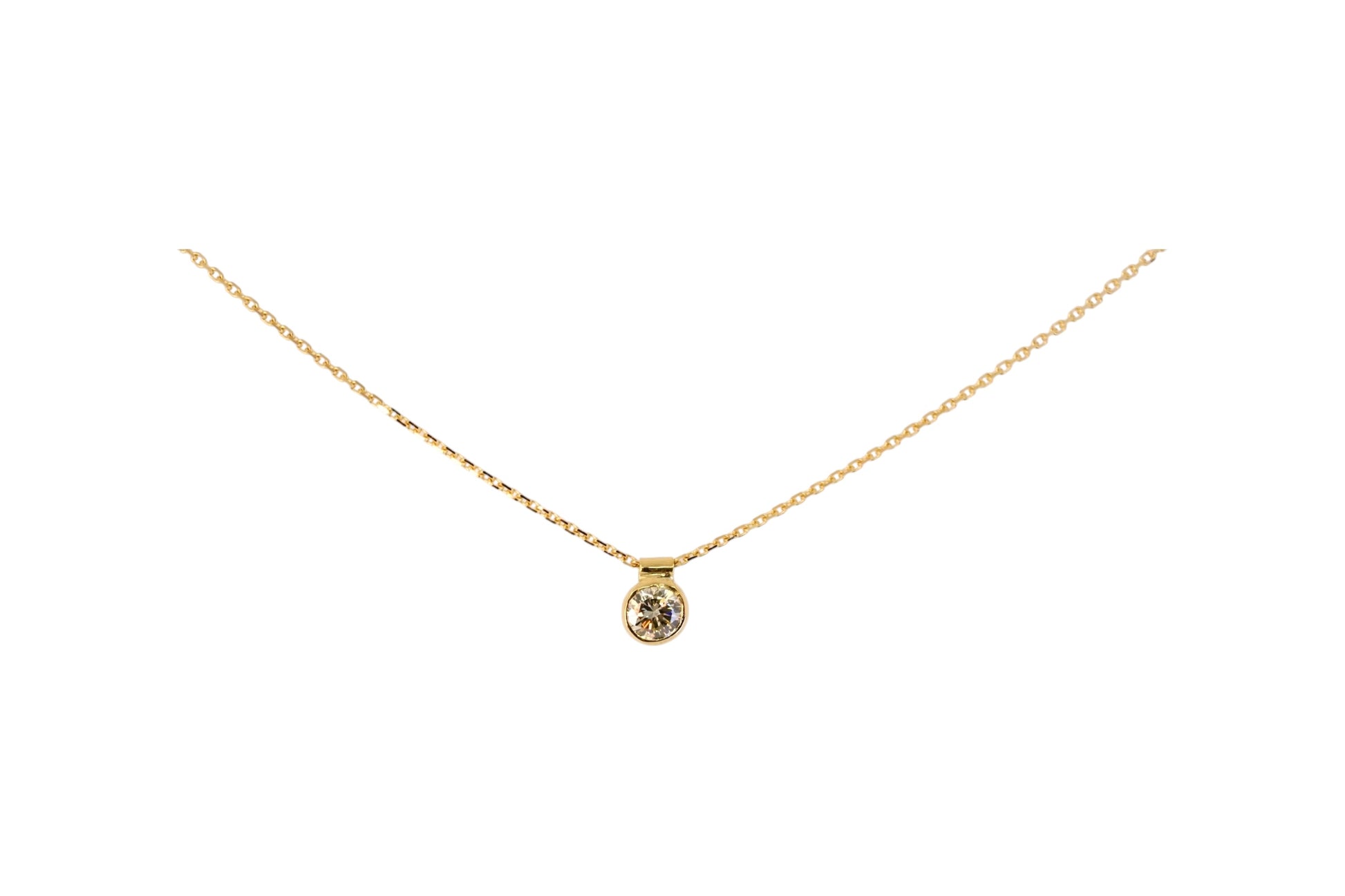 A beautiful champagne diamond is set in 18ct yellow gold and suspended from a sparkling diamond-cut chain. This pendant brings warmth and elegance to your jewellery collection.