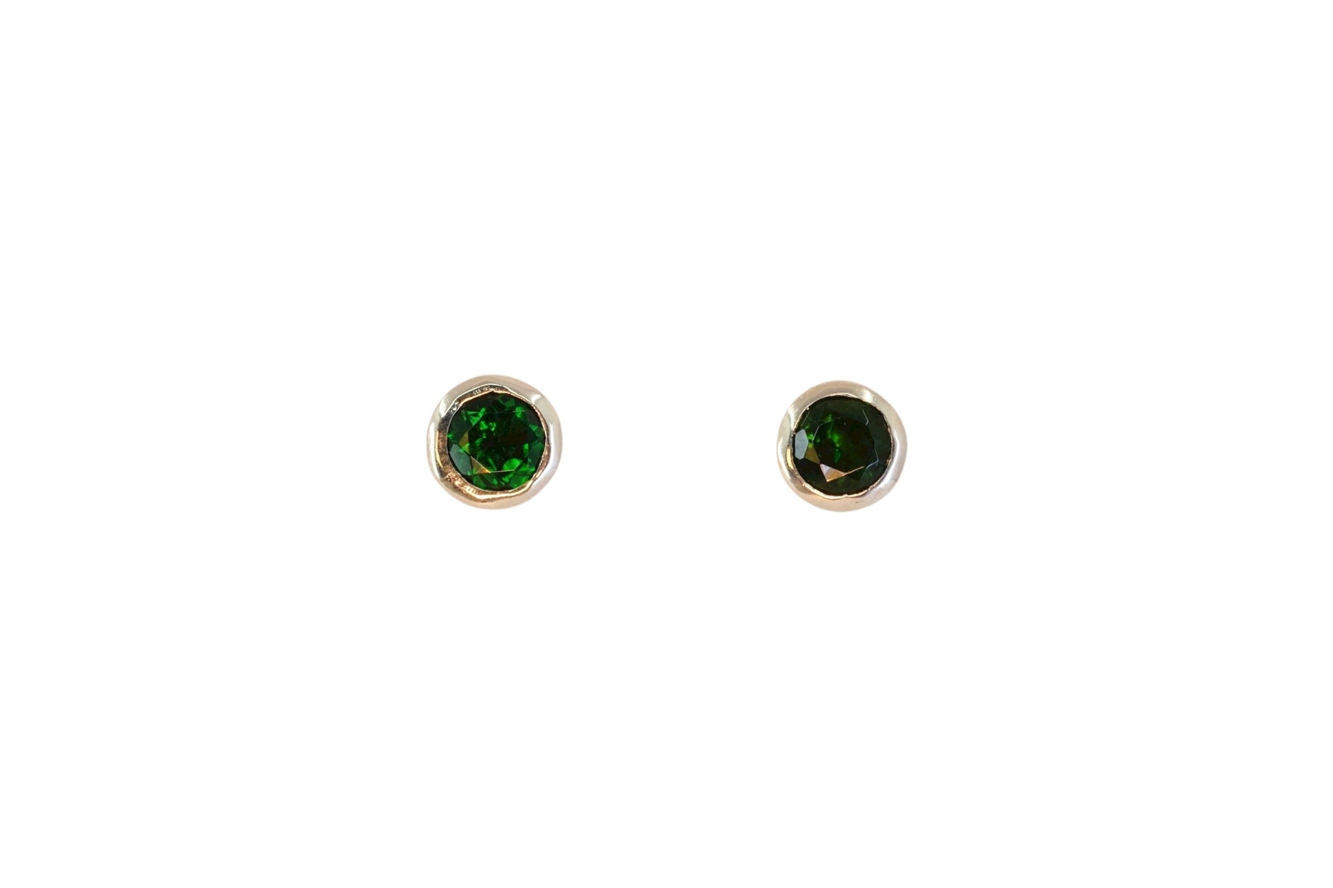 Round chrome tourmalines are set in sterling silver studs. Unique, understated, and great for daily wear.
