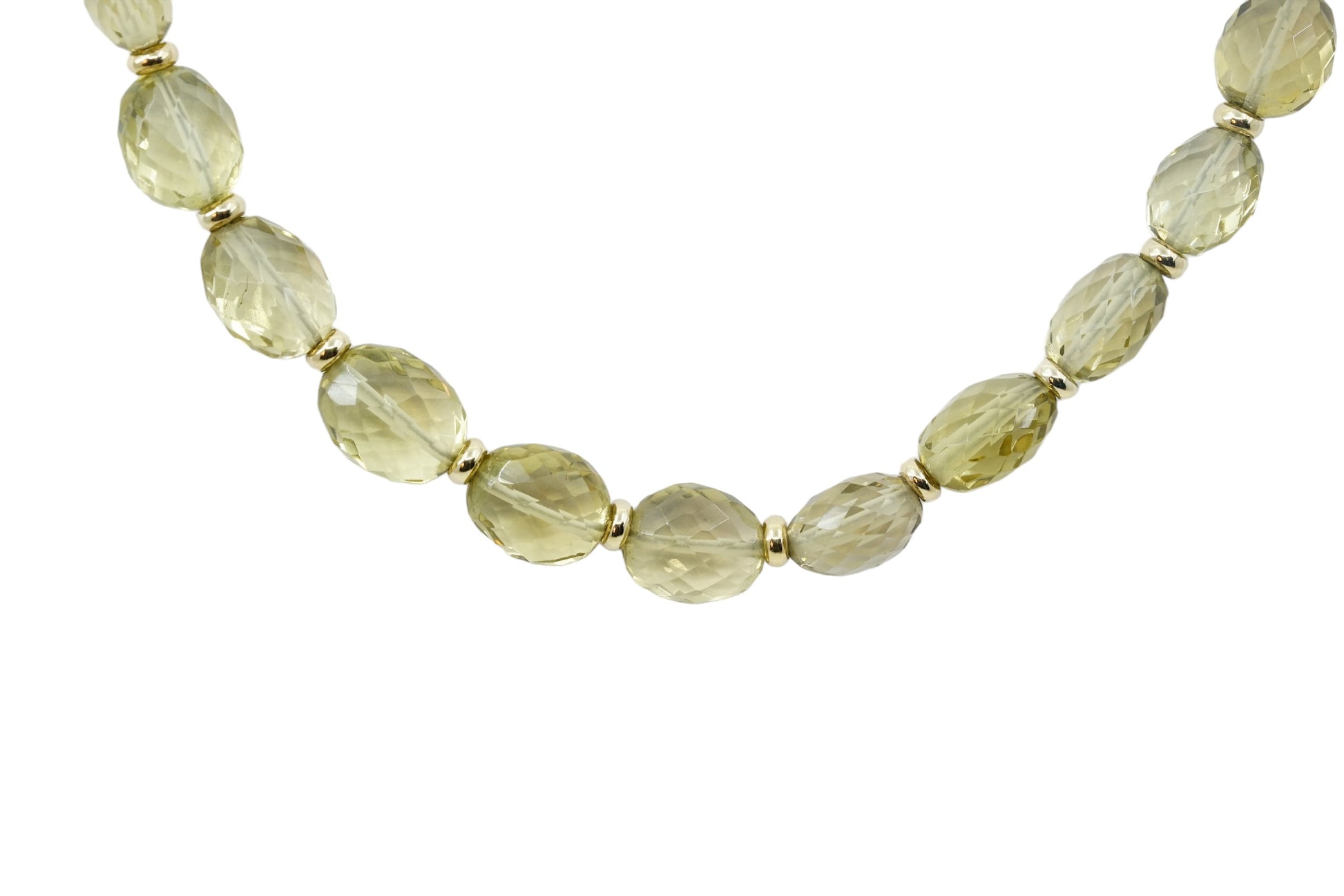 A green quartz beaded necklace with 9ct gold beads and clasp.