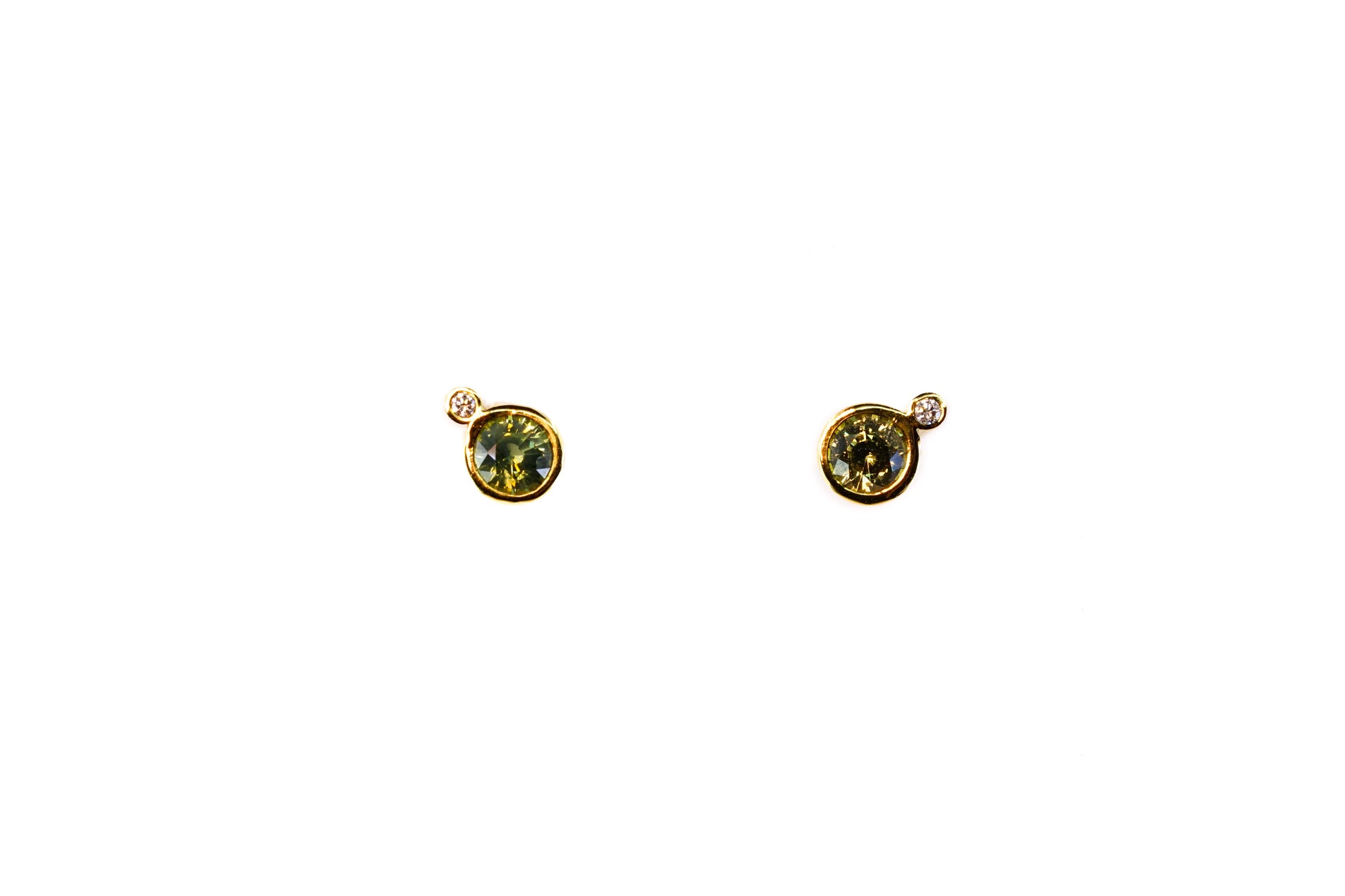 Green sapphires and diamonds set assymetricaly in 18ct yellow gold studs.
