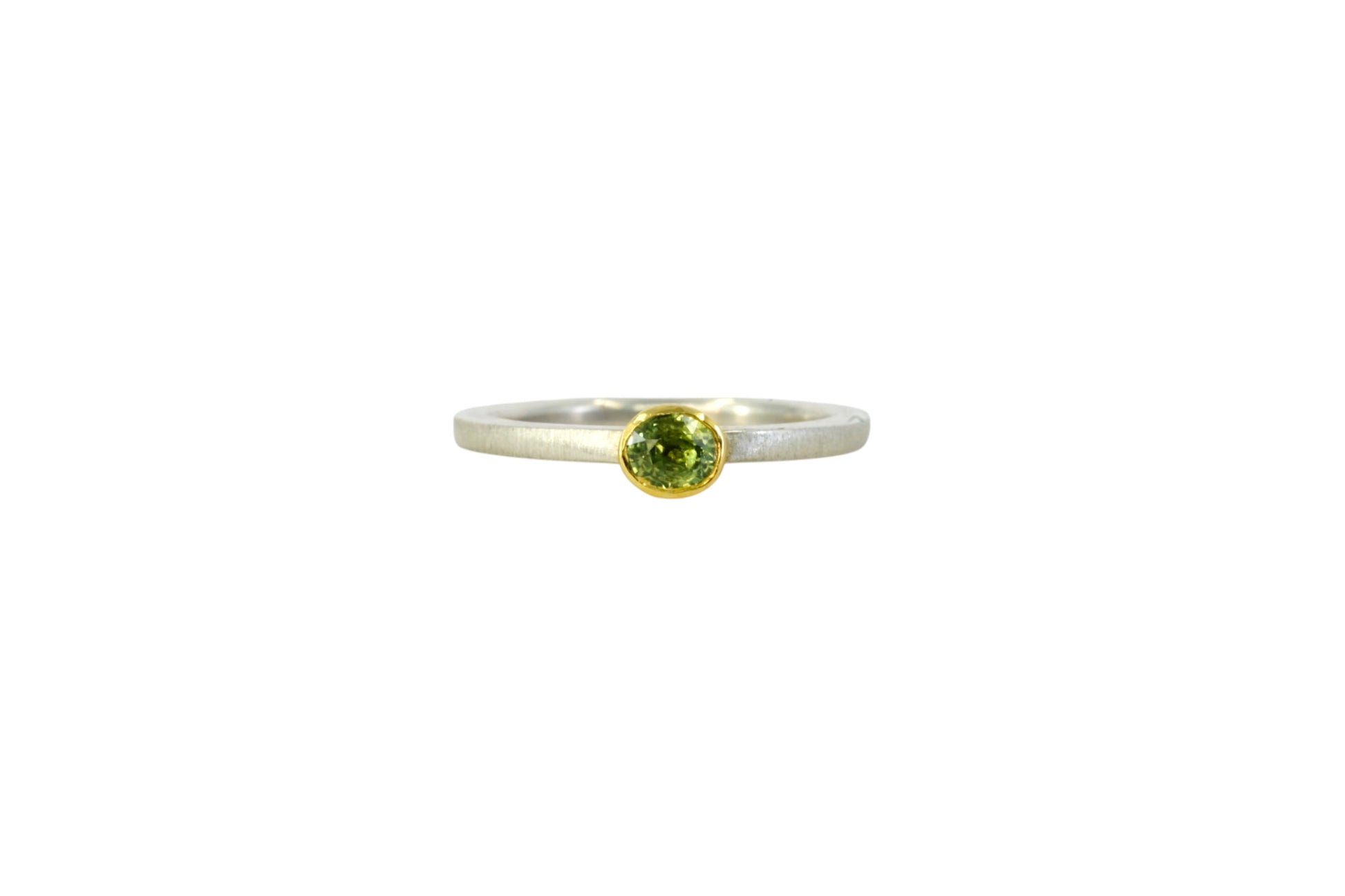 A pretty pale green sapphire set in 9ct yellow gold on a sterling silver filed band. Soft and subtle, perfect for everyday wear or stacking.