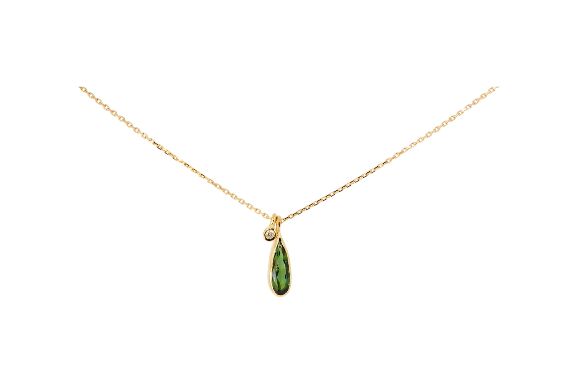 This pendant features a long pear-cut dark green tourmaline and diamond, set in 18ct yellow gold and suspended from a diamond-cut 18ct gold chain. The deep green hue adds richness and modern appeal to any outfit.