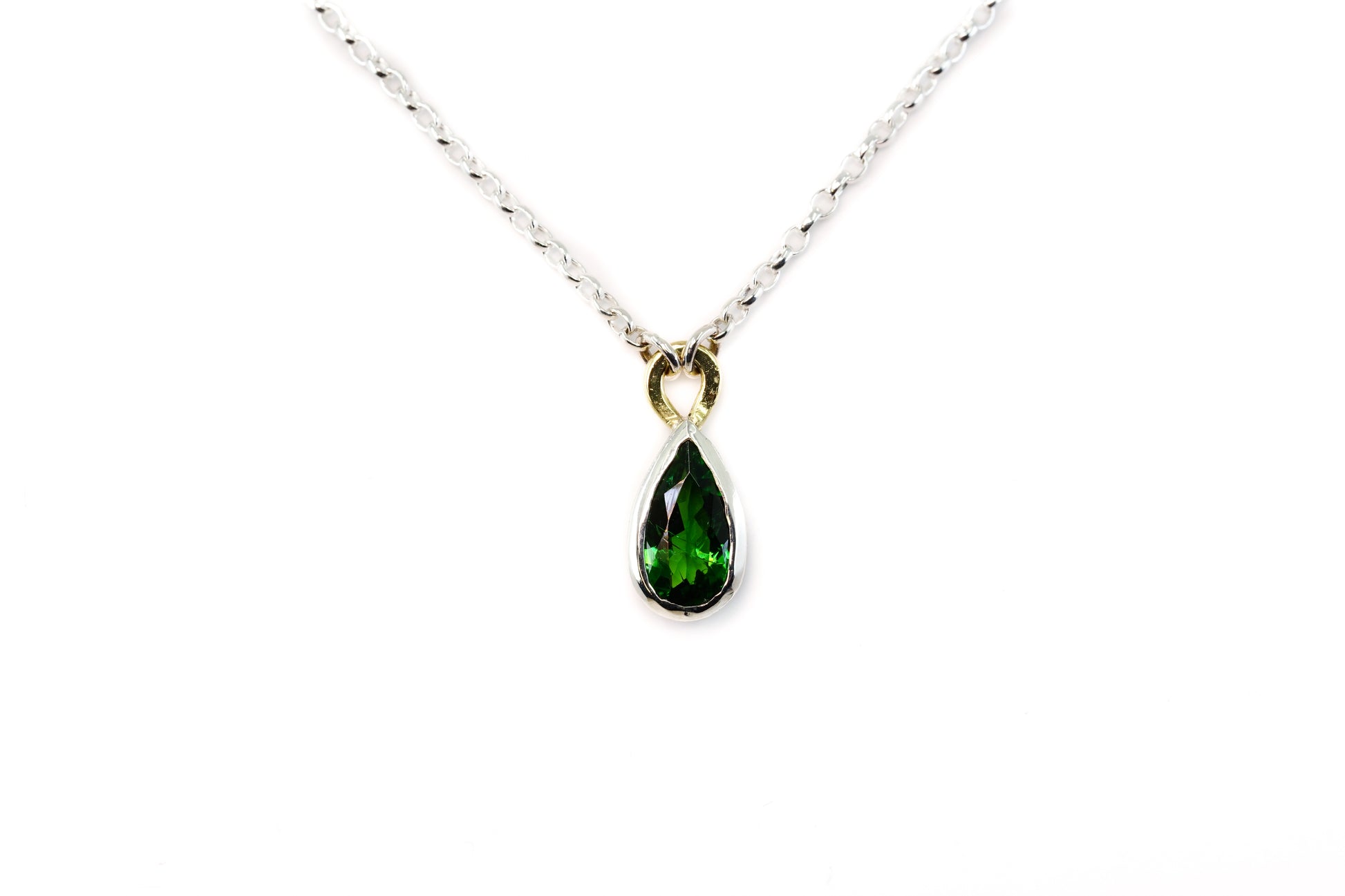 Revel in the vibrant elegance of our Green Tourmaline Pendant. A pear cut dark green tourmaline is set in sterling silver with an 18ct yellow gold bail, suspended on a sterling silver belcher chain. This pendant is a striking choice for those who love the deep, rich tones of tourmaline.