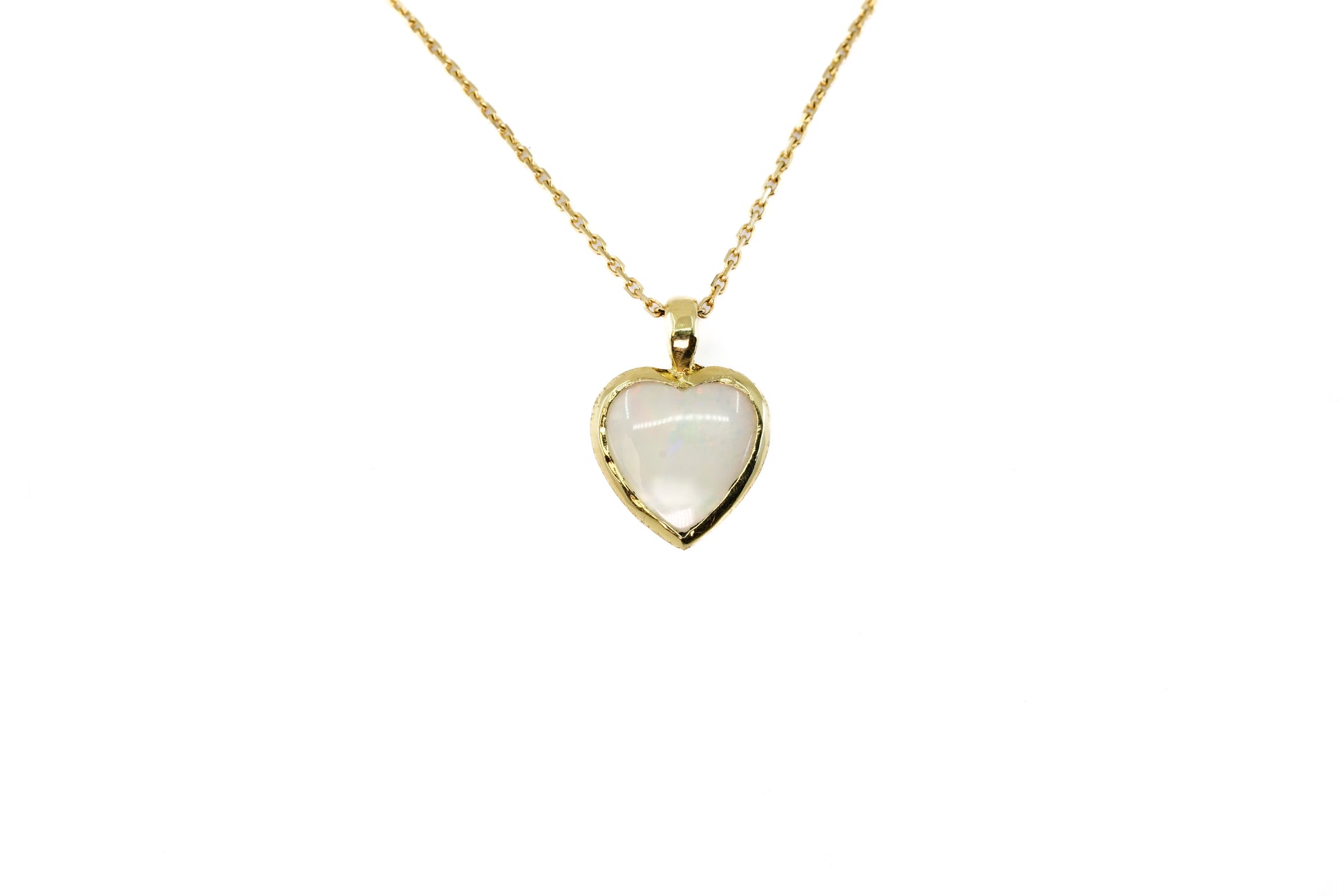 Celebrate romance with our Heart Opal Pendant. A heart-shaped white opal is set in 18ct yellow gold, with a sterling silver back and an 18ct yellow gold diamond cut trace chain. This piece is a testament to timeless elegance, perfect for adding a romantic touch to any outfit.