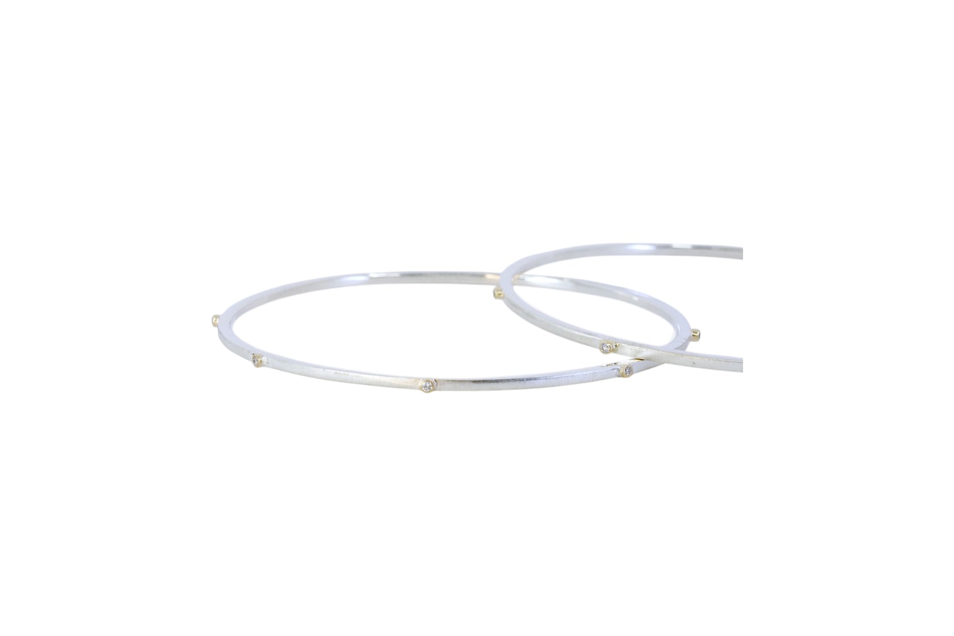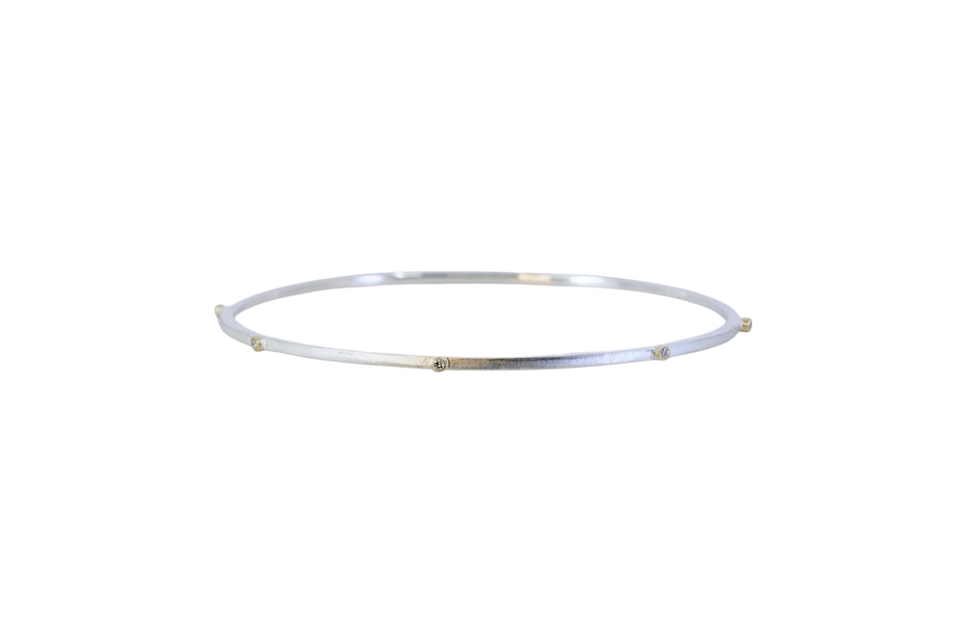 A fine sterling silver bangle with a soft matte finish, accented by little diamonds set in 9ct yellow gold all around the band. This bangle offers subtle sparkle and timeless elegance—perfect for everyday wear or special occasions. Comfortable, versatile, and effortlessly chic.