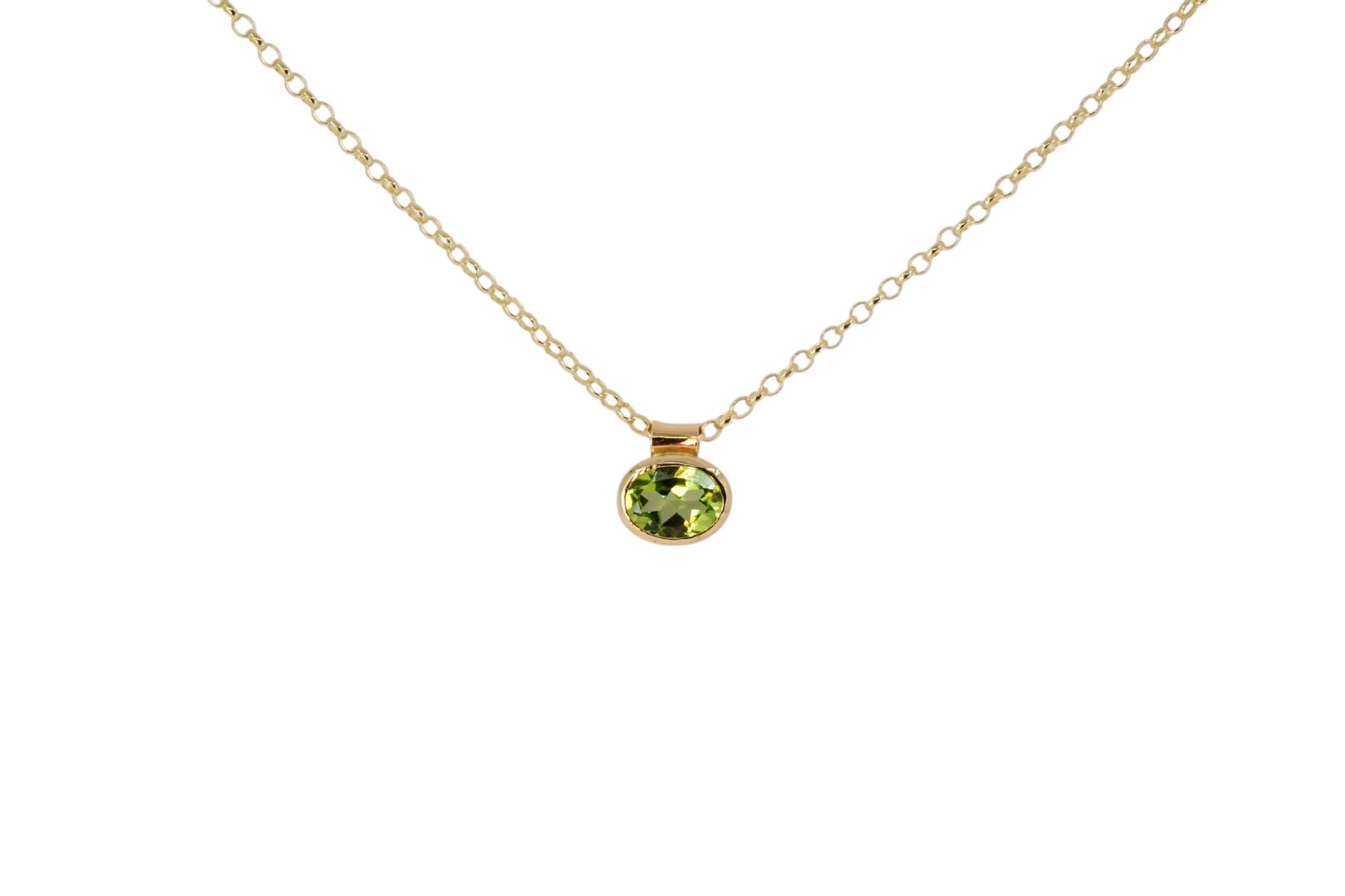 An oval peridot is set in 9ct yellow gold and suspended from an 18-inch 9ct gold belcher chain. The vibrant green stone adds a bright, uplifting touch to any outfit, while the classic setting ensures lasting appeal.