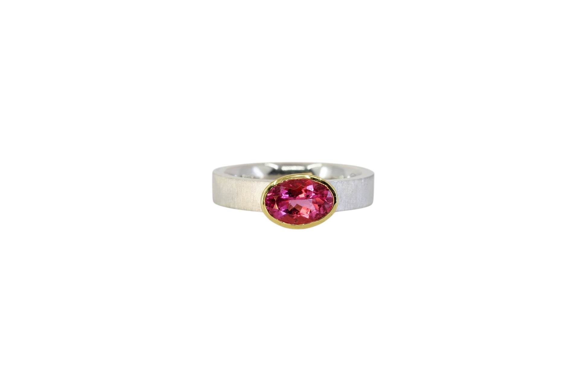 A bright pink oval tourmaline is set in 18ct yellow gold on a wide sterling silver matte finished ring band. Bold, feminine, and perfect for making a statement.