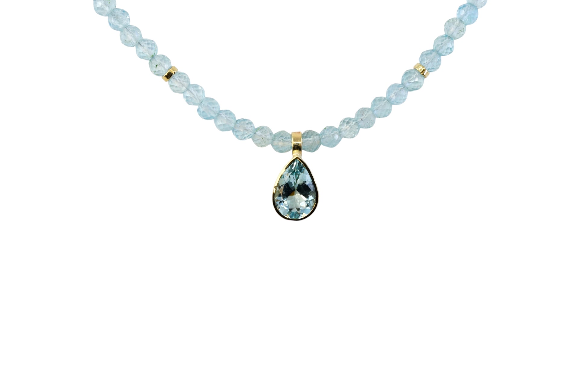 Pear cut large Aquamarine set in 9ct yellow gold on an aquamarine beaded necklace.
