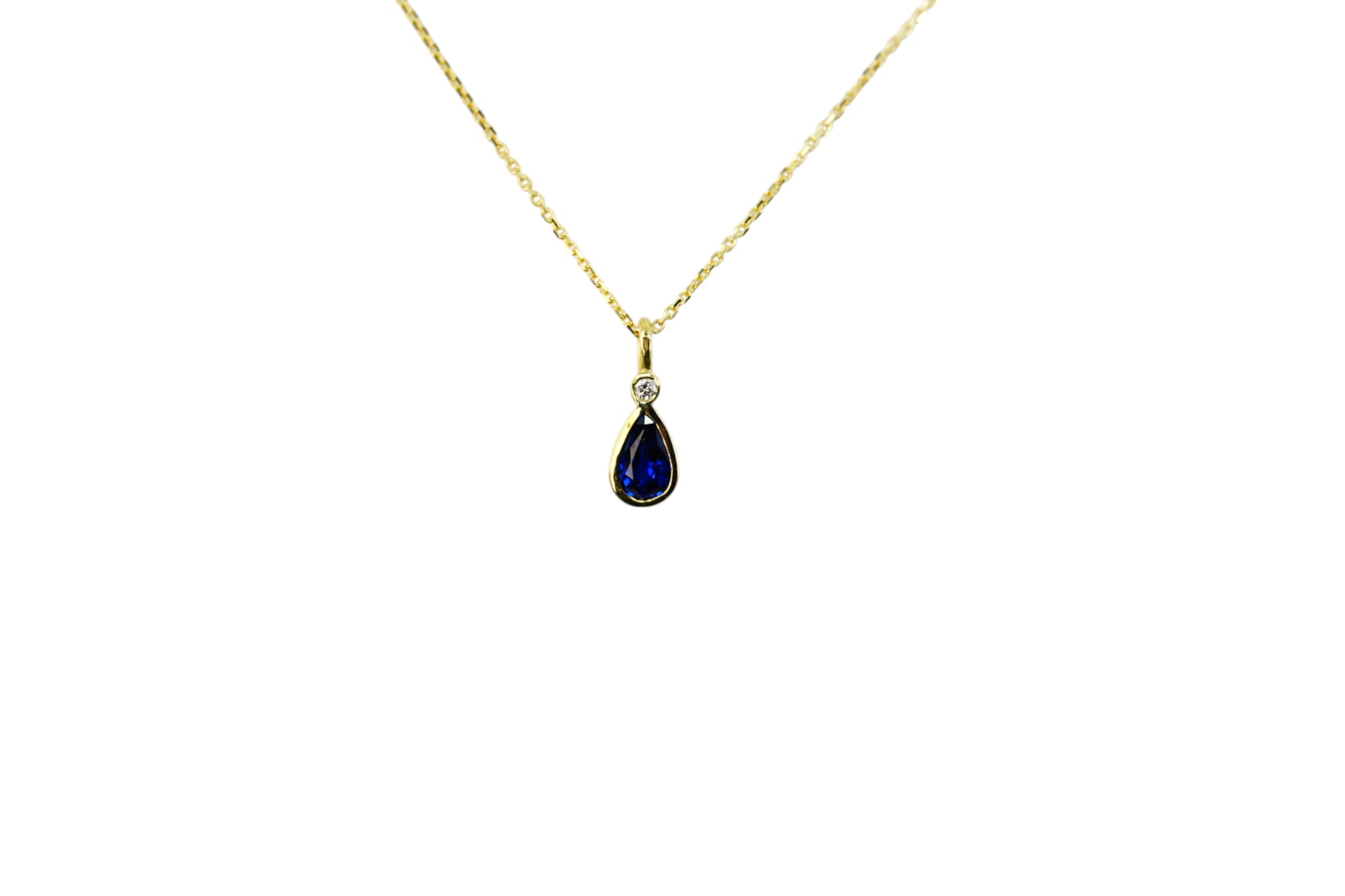 Pear cut deep blue sapphire with little white diamond all in 18ct yellow gold.