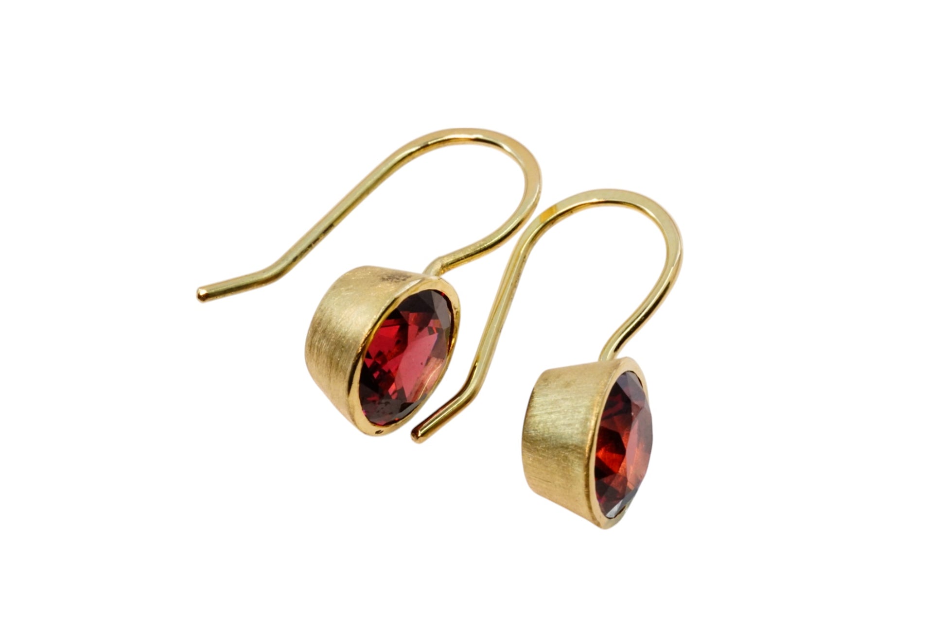 Bright and firey rhodolite garnets 18ct yellow gold on delicate hooks.