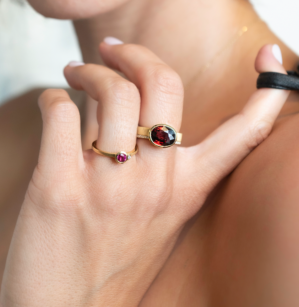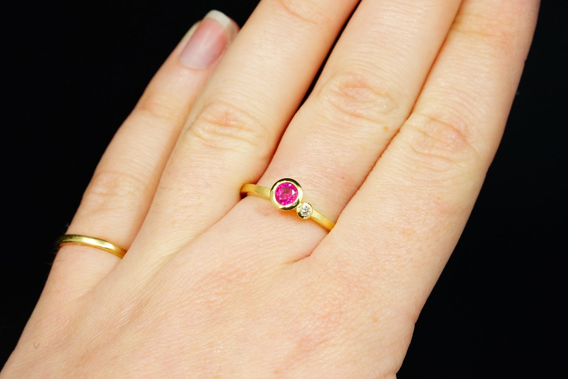 Bright ruby set in 18ct yellow gold alongside a pretty diamond.