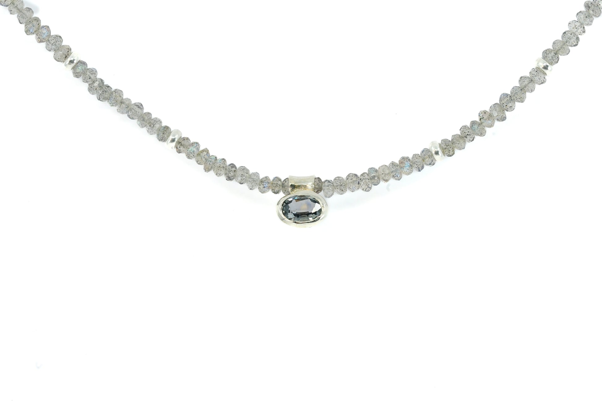 Indulge in our Sapphire and Labradorite Necklace. The stunning pendant, made of sterling silver, showcases a grey sapphire. Paired with a labradorite bead necklace, this piece is a timeless addition to any jewellery collection.