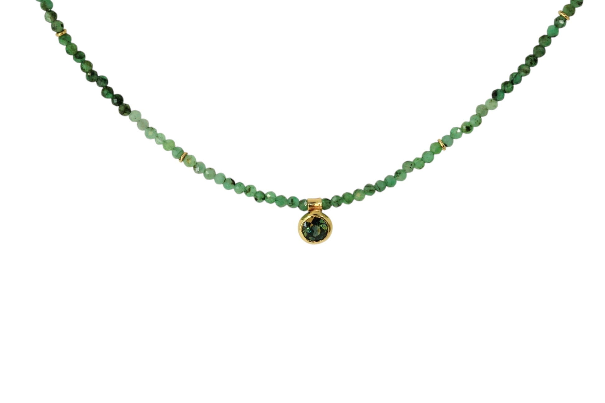 A teal green round sapphire, set in a polished 9ct yellow gold pendant, suspended from a delicate string of fine green emerald beads fastened with a gold s-hook clasp. Earthy and elegant in equal measure, the richness of the emerald beads draws out every green depth in the sapphire. A one-of-a-kind piece from the Libby Rak workshop — subtle, considered and utterly wearable.
