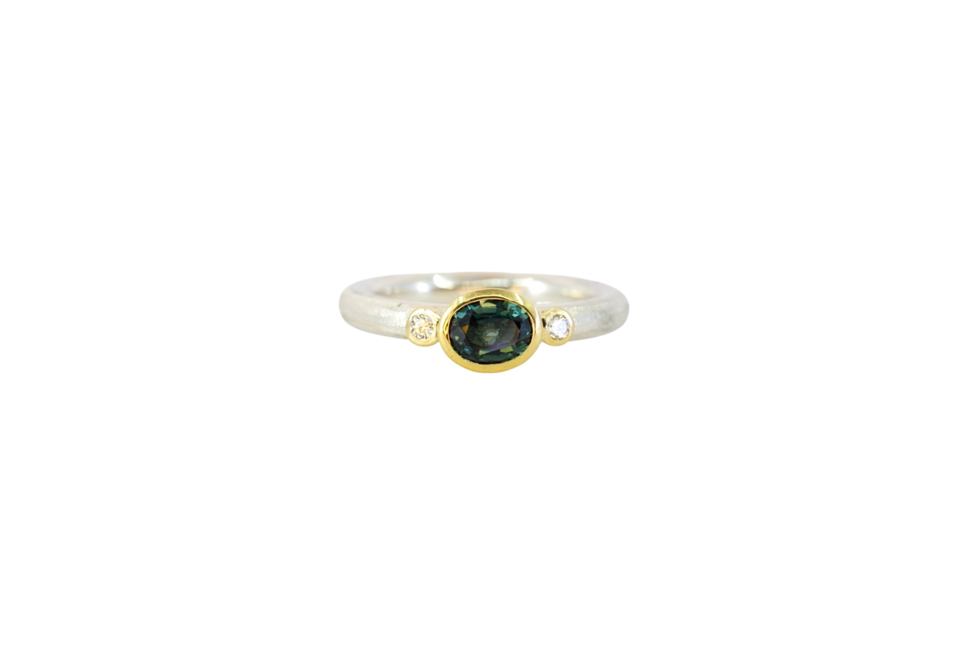 Dramatic colour meets timeless design in this chunky trilogy ring. A striking oval teal sapphire takes centre stage, accented by diamonds and set in 18ct yellow gold on a substantial sterling silver band. Crafted for comfort and longevity, this piece is as unique as the person who wears it. Signature Òcomfy jewelleryÓ fit. Ideal for gifting or self-indulgence.