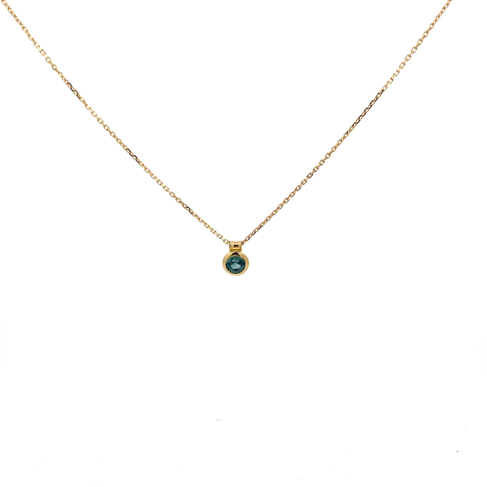 Teal sapphire set in 18ct yellow gold.