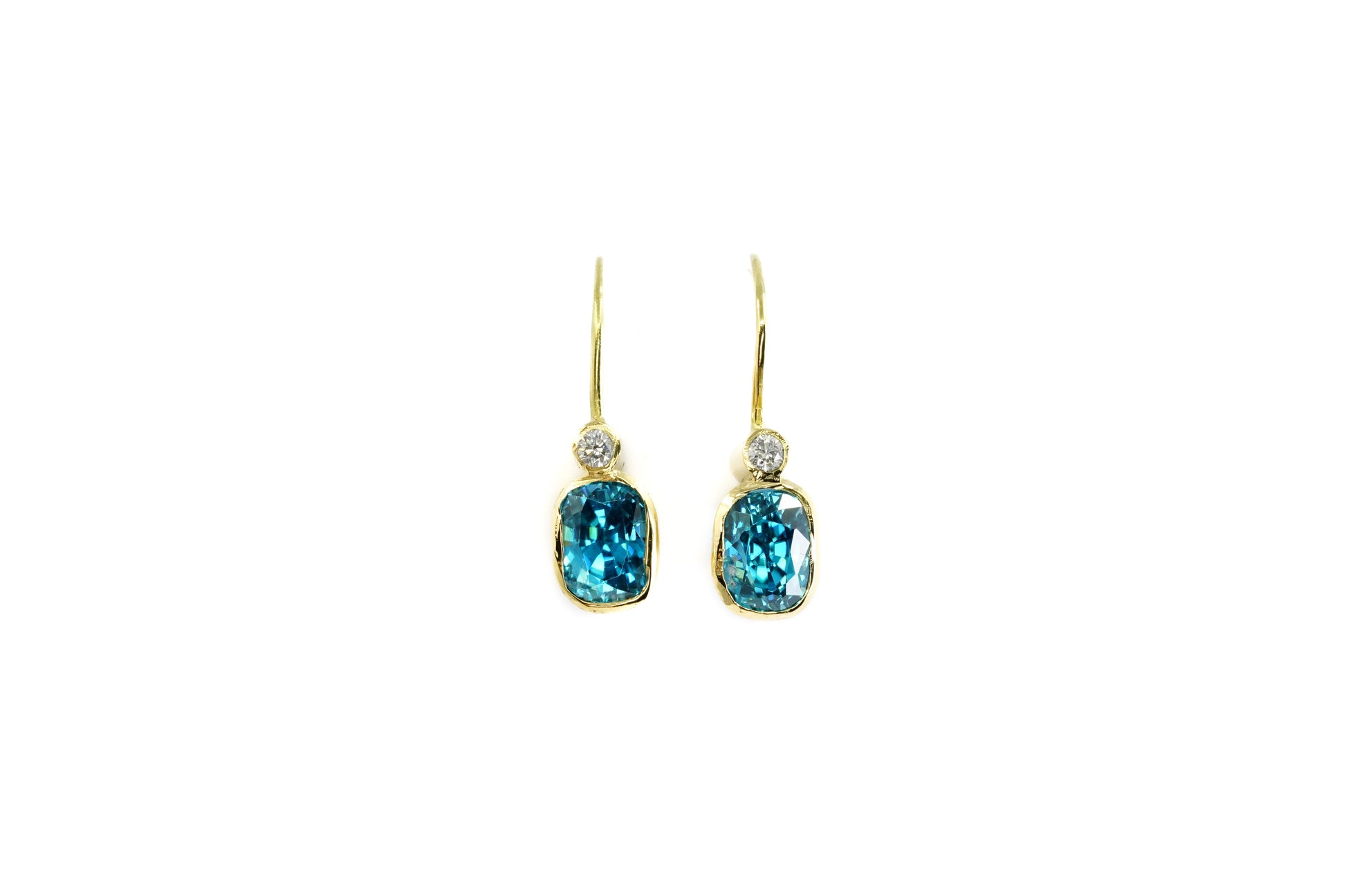 Discover the sparkling beauty of our Zircon and Diamond Drop Earrings. Bright blue zircon is set in 18ct yellow gold with a little diamond on a drop hook, offering a luxurious and captivating design.